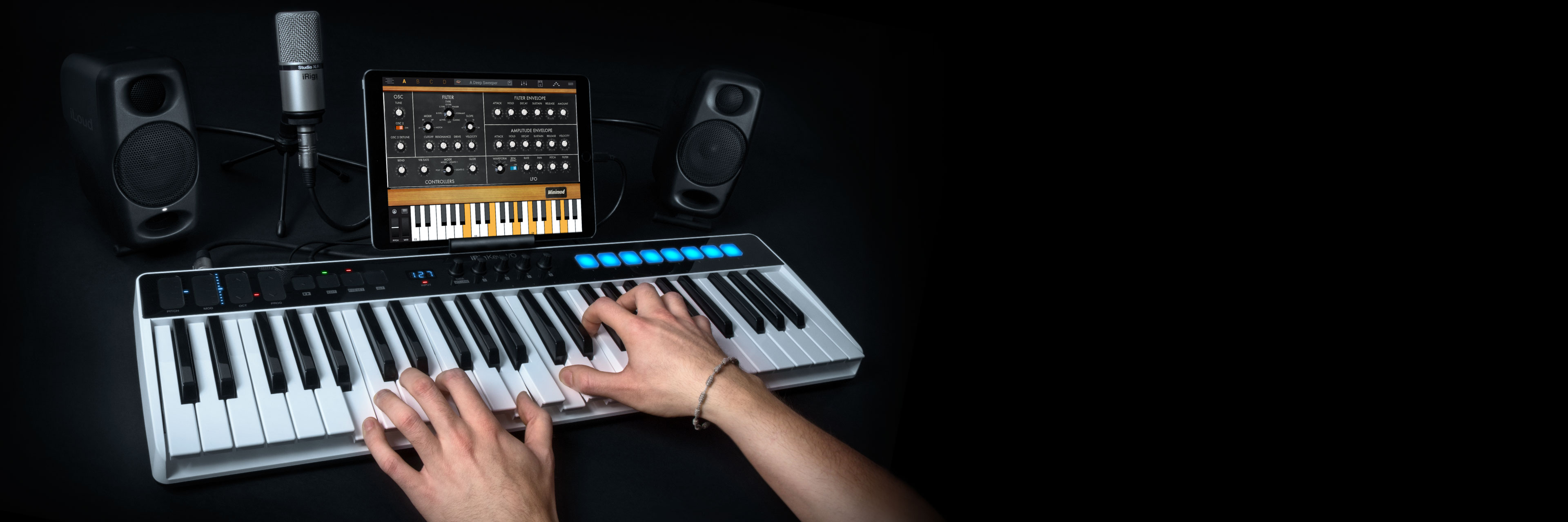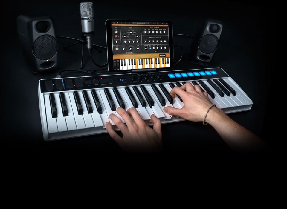 Together with an audio interface, iRig Keys I/O also packs all the controls you would expect from a premium controller including velocity sensitive multicolored pads and programmable touch-sensitive sliders, buttons and knobs for unique expressiveness and fast workflow.