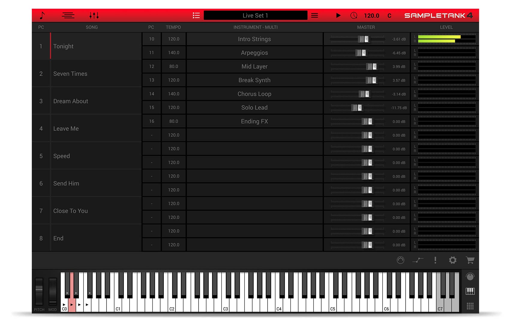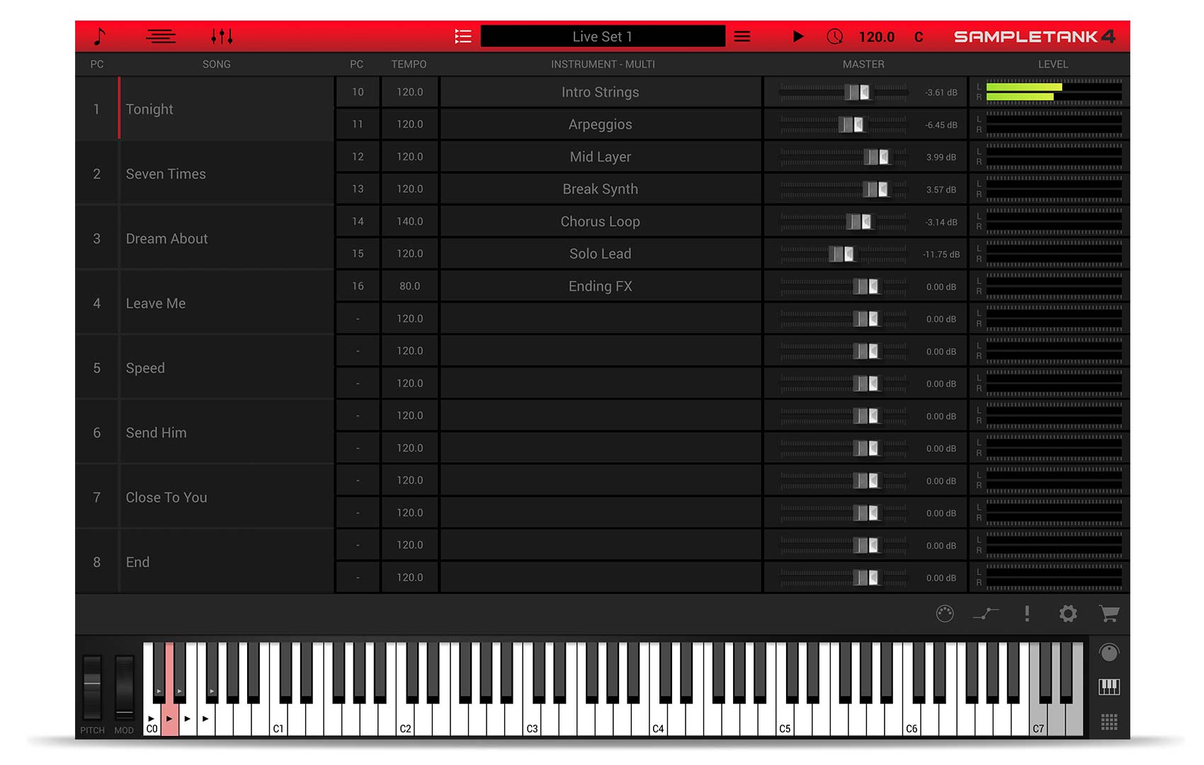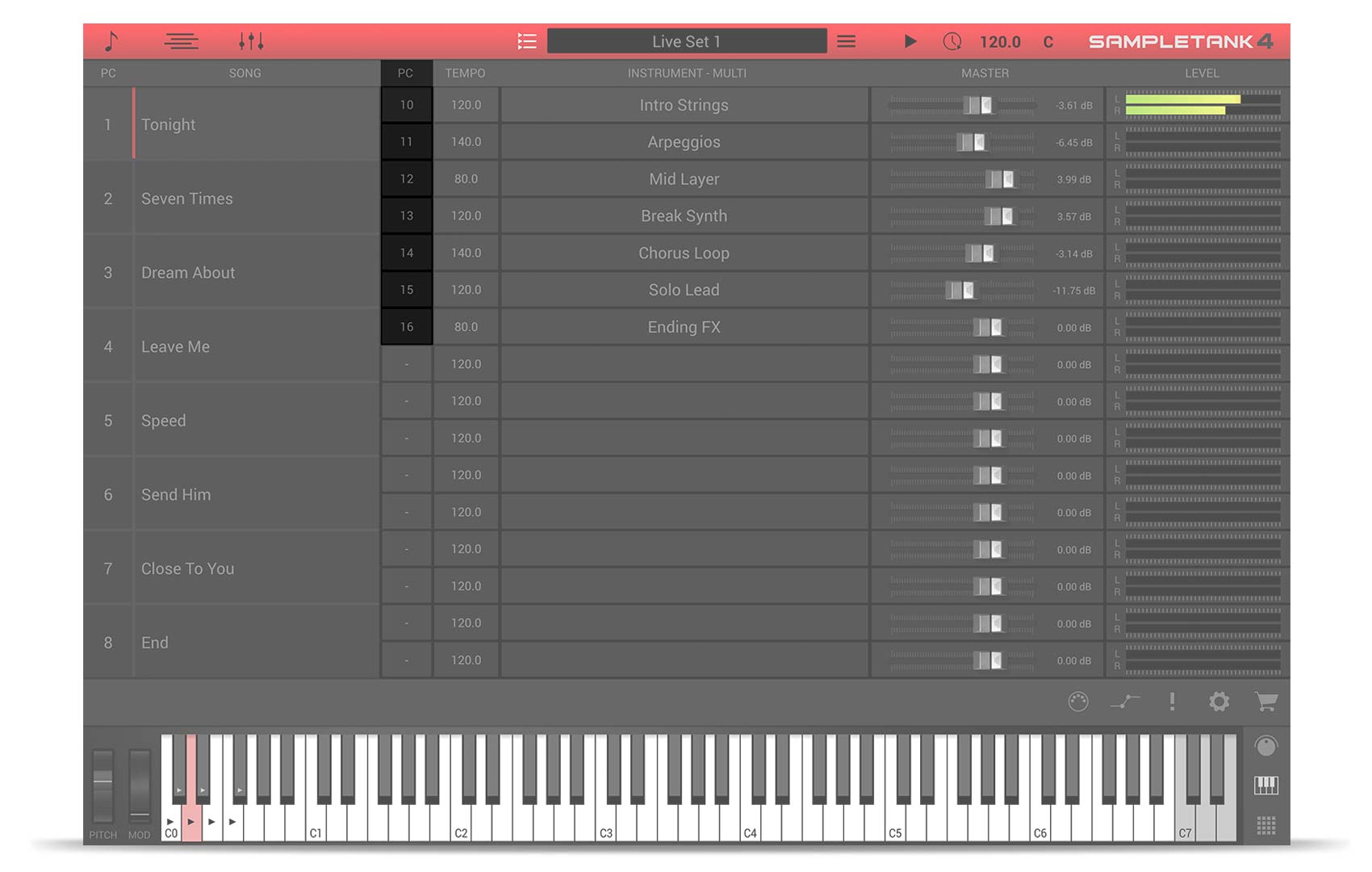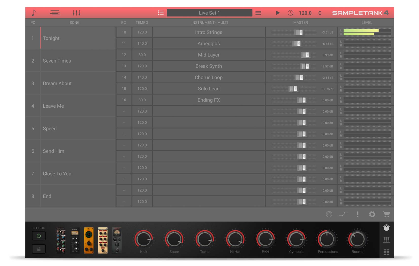 A great song deserves to be performed, so SampleTank 4 makes this easier than ever to hit the stage. A unique, re-designed Live mode lets you build an entire set list and gives you the controls you need right at your fingertips for your live performances.