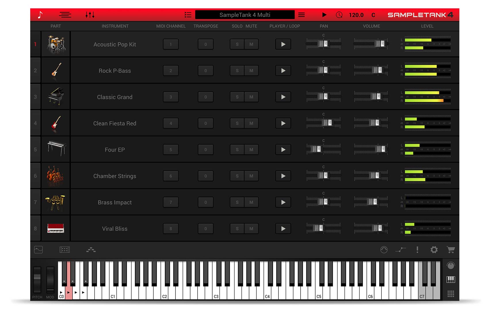 SampleTank has always made it easy to layer and mix sounds, and the new Parts interface streamlines this process even more, with visual indications of each sound loaded, and instant access to volume, pan, mute, and solo controls.