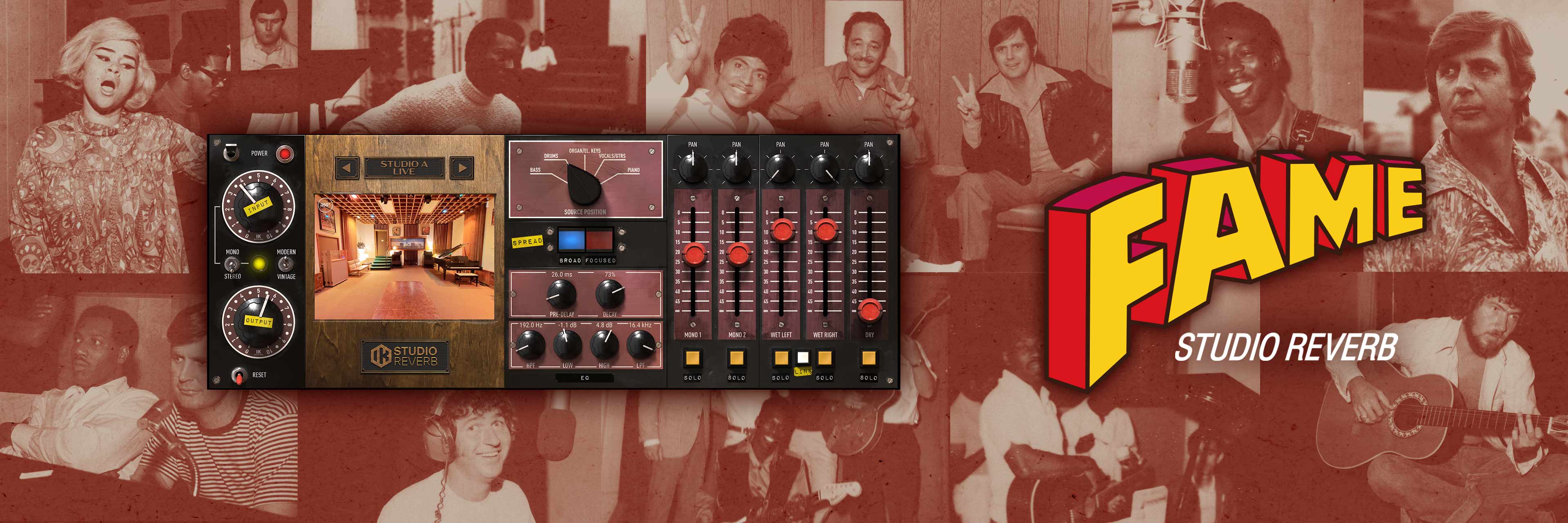 IK worked hand-in-hand with FAME to precisely capture not just the mic placement used on all their iconic albums, but where the performers were as well. Select which instrument you’re processing and T-RackS FAME Studio Reverb instantly re-positions both microphones and source in the room, putting you right where the magic happened.