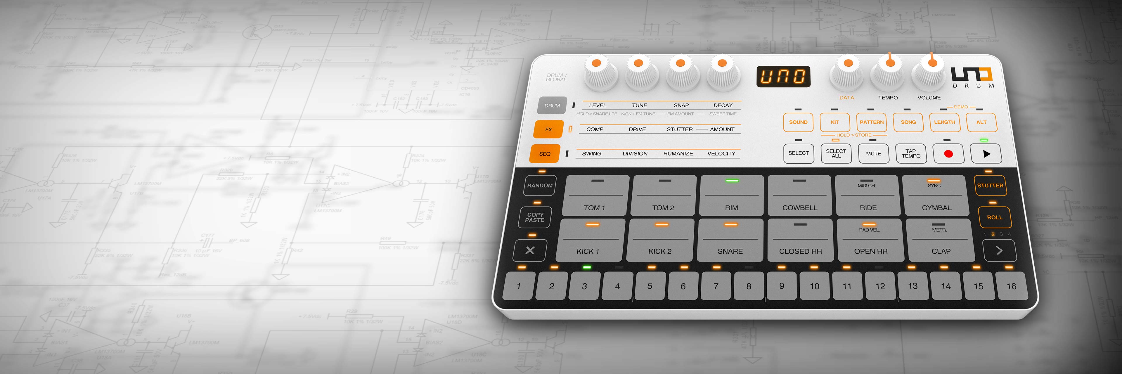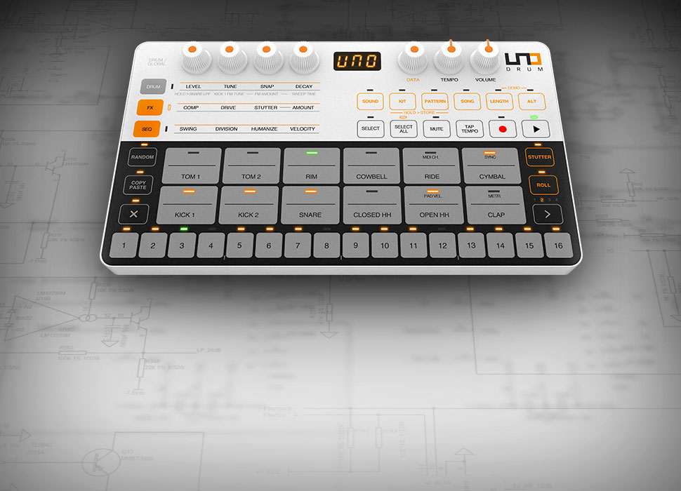 UNO Drum is the ultimate beat creation station for anyone and everyone to create warm, punchy, high-quality, and inspiring grooves. Made in collaboration with Italian analog specialist Soundmachines, UNO Drum follows the acclaimed UNO Synth, combining massive analog tone with digital flexibility and convenience.